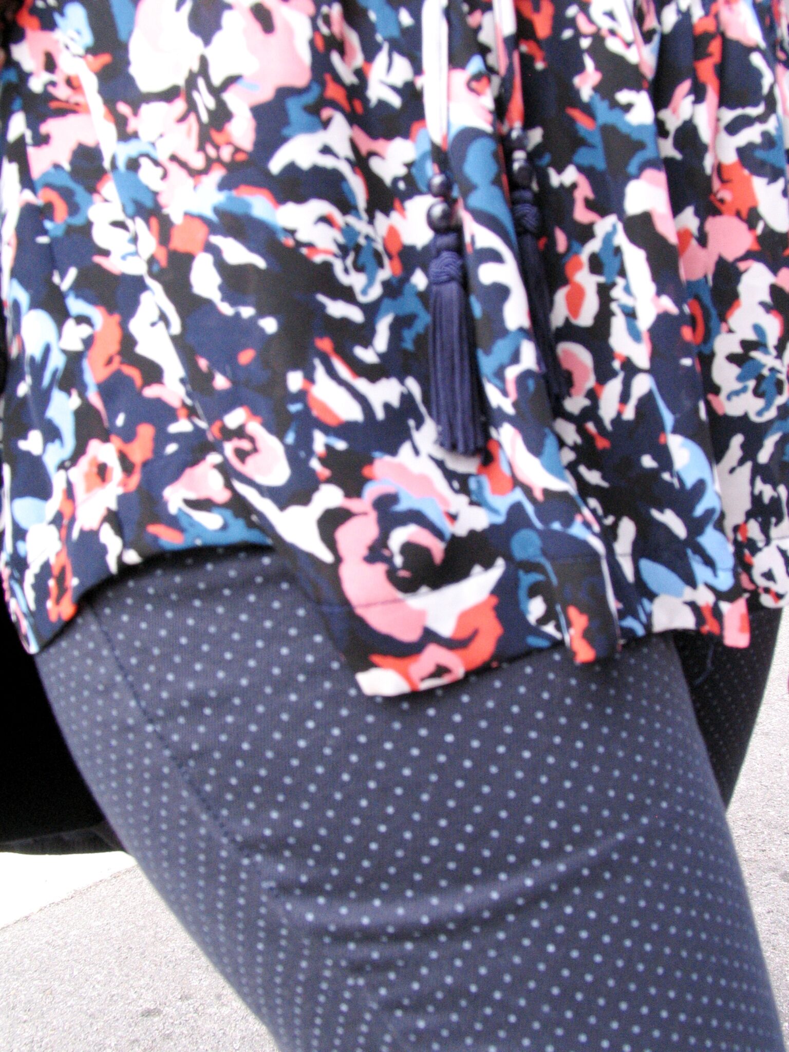 Patterned shirt, gray trousers, and brooches for a touch of bling