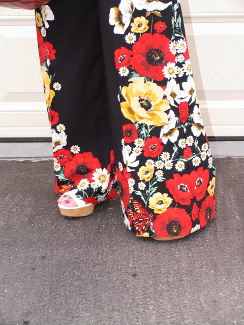 Patterned shirt, gray trousers, and brooches for a touch of bling