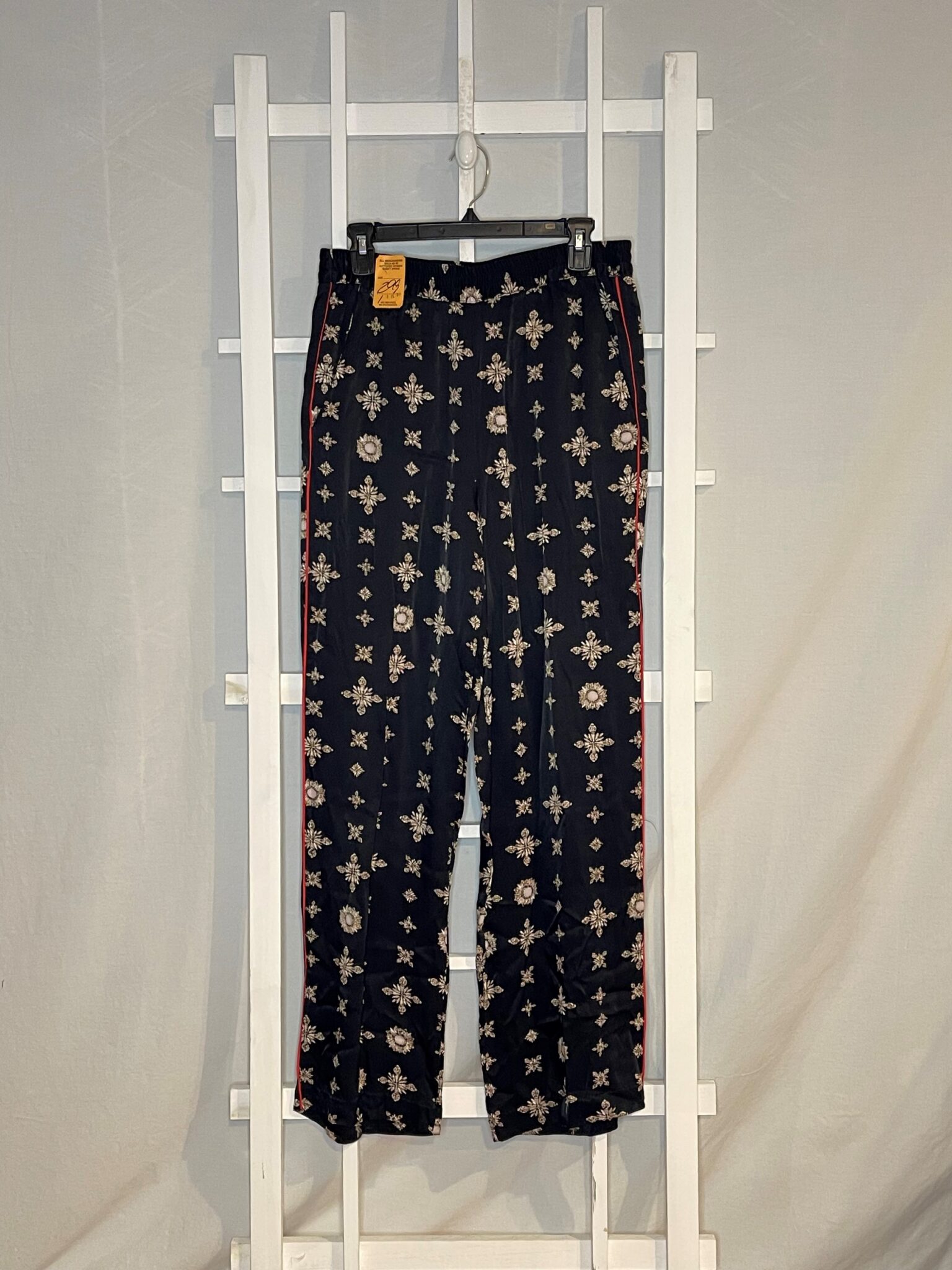 Patterned shirt, gray trousers, and brooches for a touch of bling