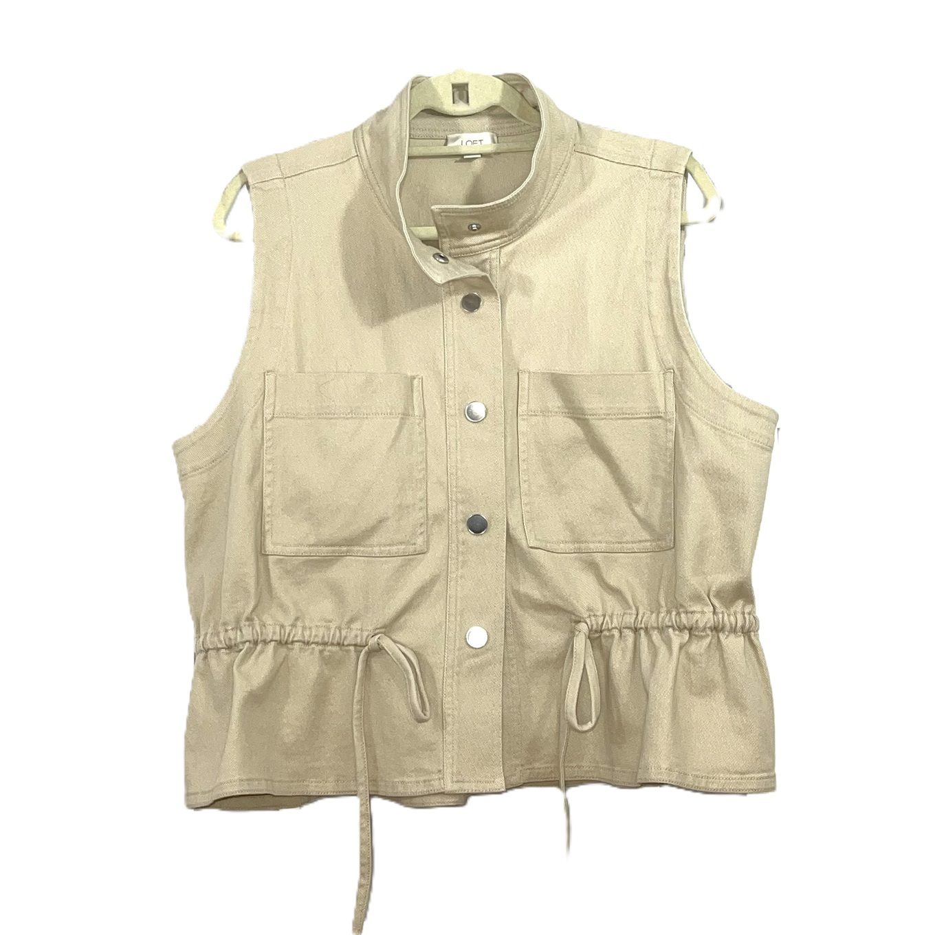 Loft tan funnel-neck vest with adjustable waist, a versatile layering piece that adds polish to casual looks