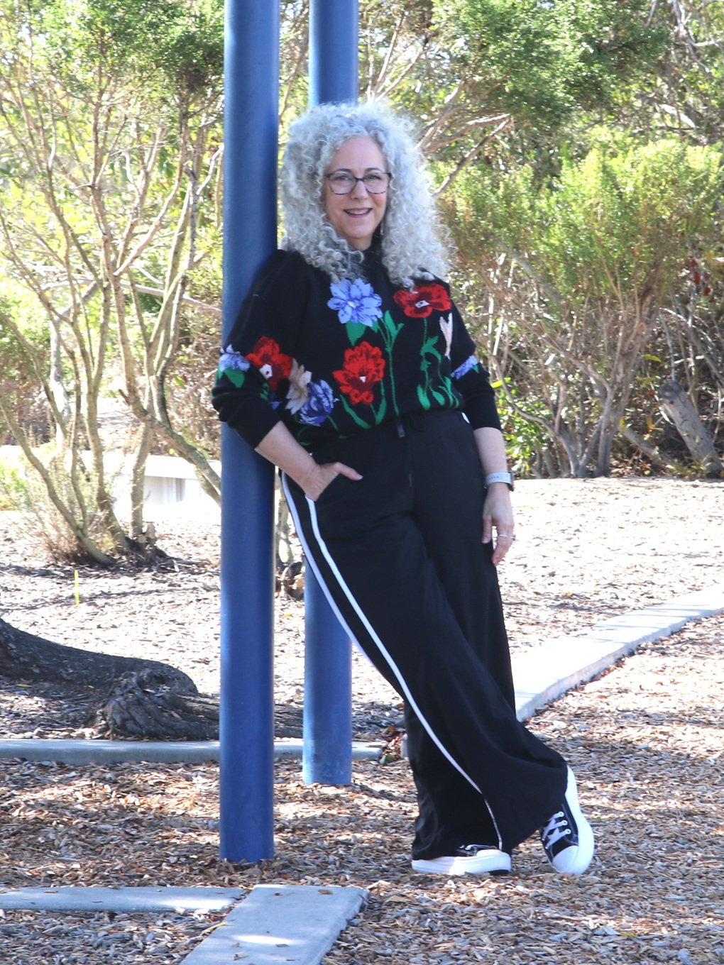 Rena leaning casually against a blue pole in a floral sweater and striped track pants, casual sporty outfit inspiration