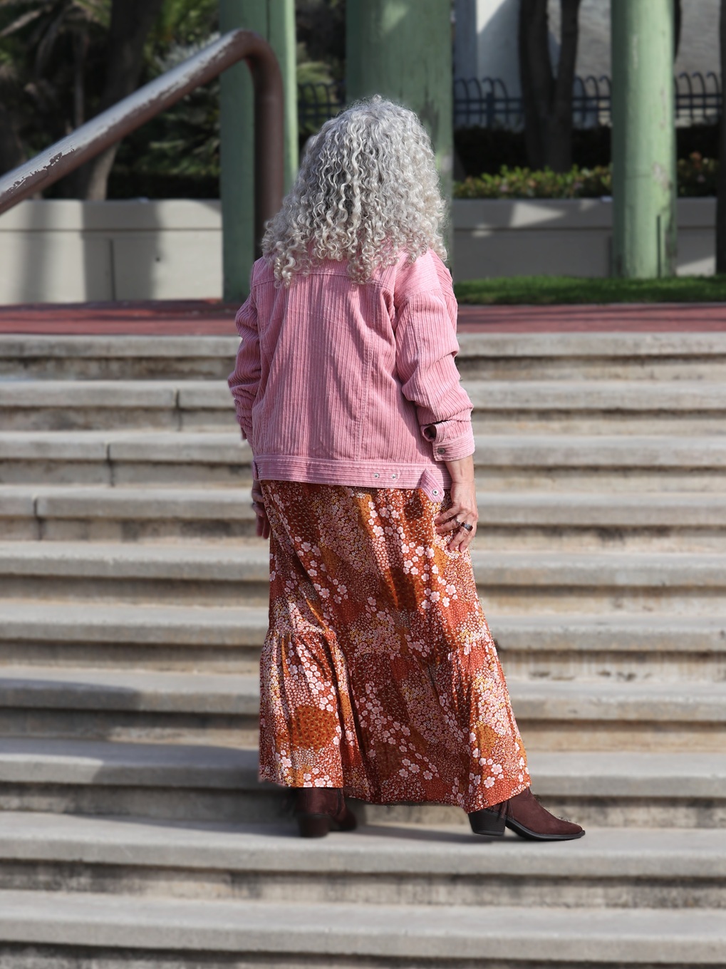Back view of Rena in a pink corduroy jacket and rust-floral skirt, walking up concrete steps with soft natural light highlighting her silver curls