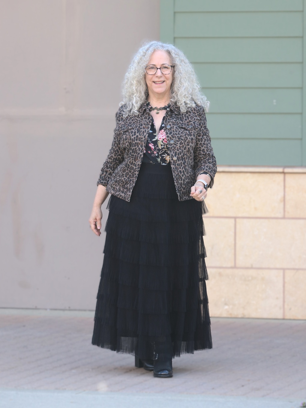 Rena walking toward the camera in a leopard and floral outfit with a tiered black skirt, demonstrating stylish movement and pattern mixing.