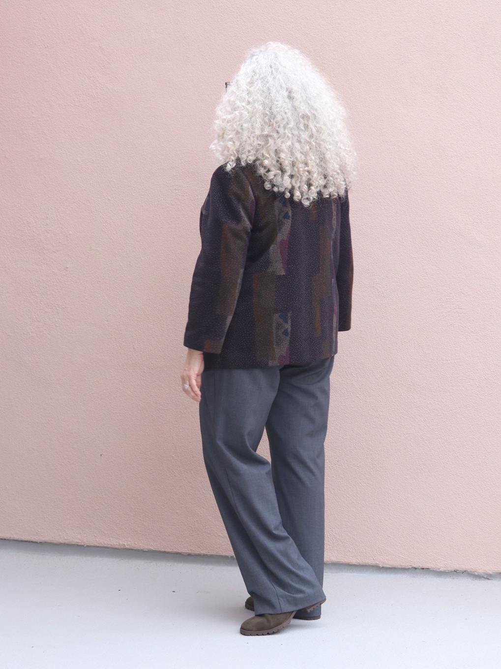 Rena wearing gray trousers with a patterned thrifted blazer and a sequined pineapple tank for a relaxed, playful secondhand outfit.